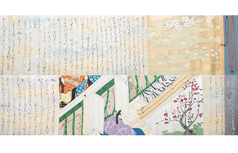 伊太郎氏の孫で、現在は紫紘に勤める野中彩加氏と淳史氏姉弟は制作の経緯を語りながら、最初に手掛けた『源氏物語第三部の竹河(一)』に続く場面の作品を広げてくれた。光源氏の不義の子、薫が年賀に玉鬘邸を訪れたシーンである。