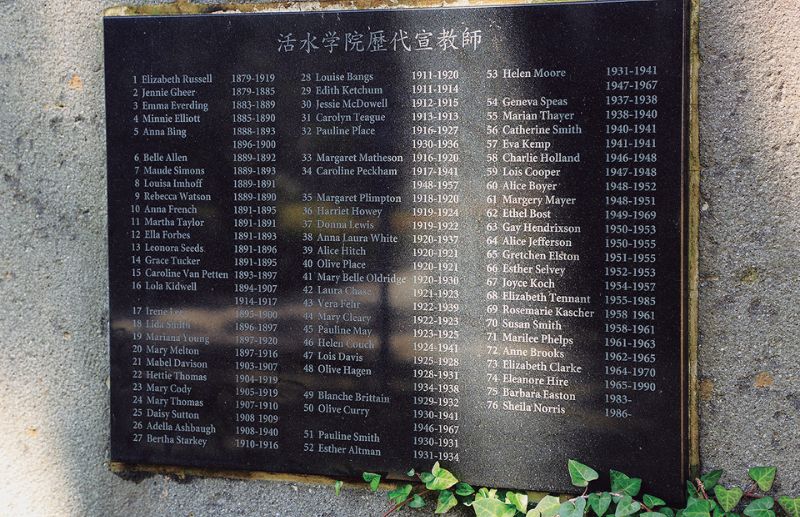 活水学院は1879(明治12)年、出島メソジスト教会の要請に応えて来日したエリザベス・ラッセル女史が創設。キャンパスには歴代宣教師の名を刻んだ碑がある。