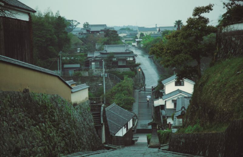 お屋敷町を抜けると、そこは酢屋の坂のてっぺんだ。杵築にはこの他にも、くの字の曲線が美しい飴屋の坂、竹やぶに覆われた番所の坂、高い石垣が特徴的な天神坂、豪商が軒を並べた富坂など、趣ある坂が随所にある。