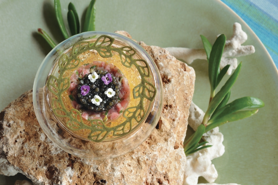 「ヤギとキャビアのタルタル フーチバの香り」。ヤギ汁に使われるフーチバ(ヨモギ)のチュイルをアクセントに添えて。キャビアのリッチな塩気が、大地と海の美味をつなぐ。