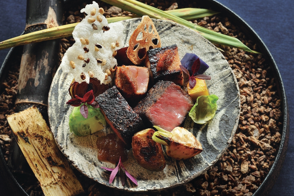 「熟成牛サーロインとマグロの炭火焼 島醤油と黒糖のアクセント。種子取祭に欠かせない穀物や胡麻をあしらいに。「島テロワール」18,150円(写真のメニューは11月まで)。